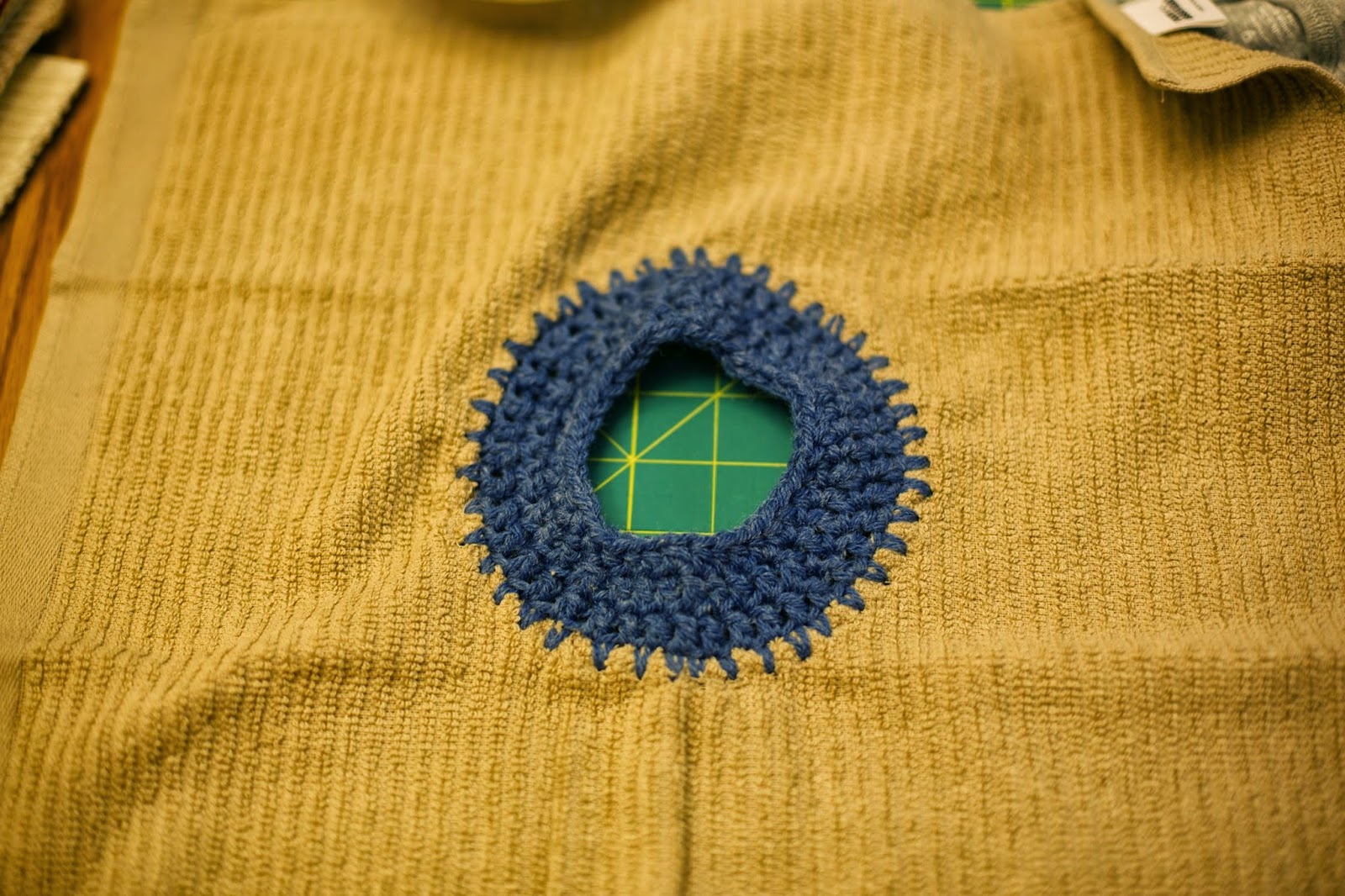 I wanted to make a bib out of a dishcloth. Seen once before, I couldn't find a pattern. My in-Laws also have a very similar bib, where the hole is near one end of terrycloth and the hole is lined with ribbing. (The bib also has a train on it and says "all I do is Choo-choo-choo" and it is adorbs. I thought it was decent pattern, but would be better if the hole were in the center so it could be a 2 sided bib(less washing!!!!!)